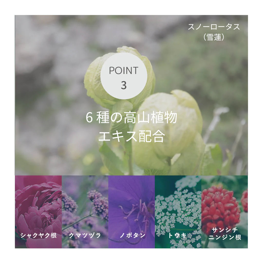 計6種類の高山植物由来エキス*が、乾燥しがちな肌にうるおいを与え、